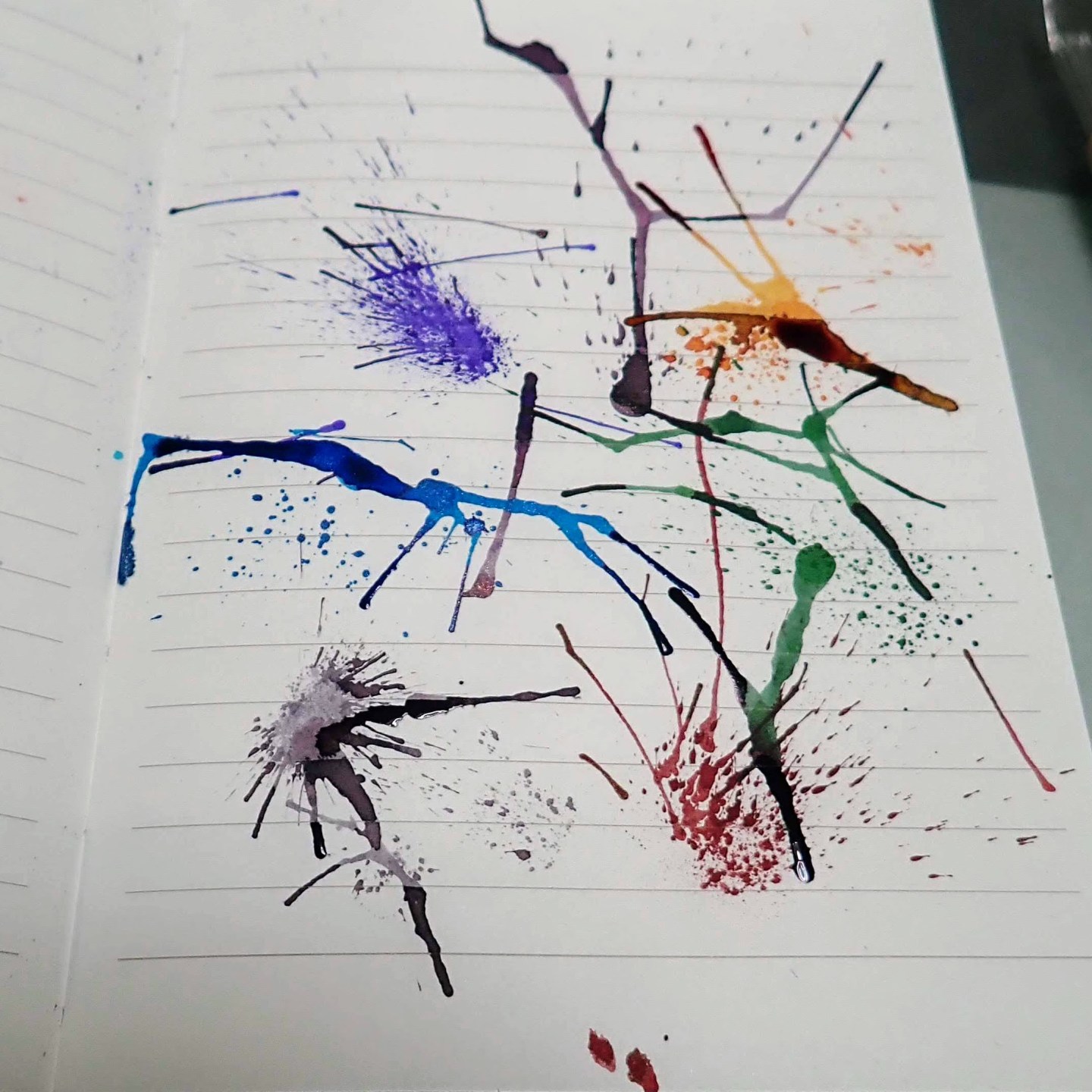ついでにインクを落として吹いて模様を描いてみます。これをやると流石の紳士のノートも裏抜けします。